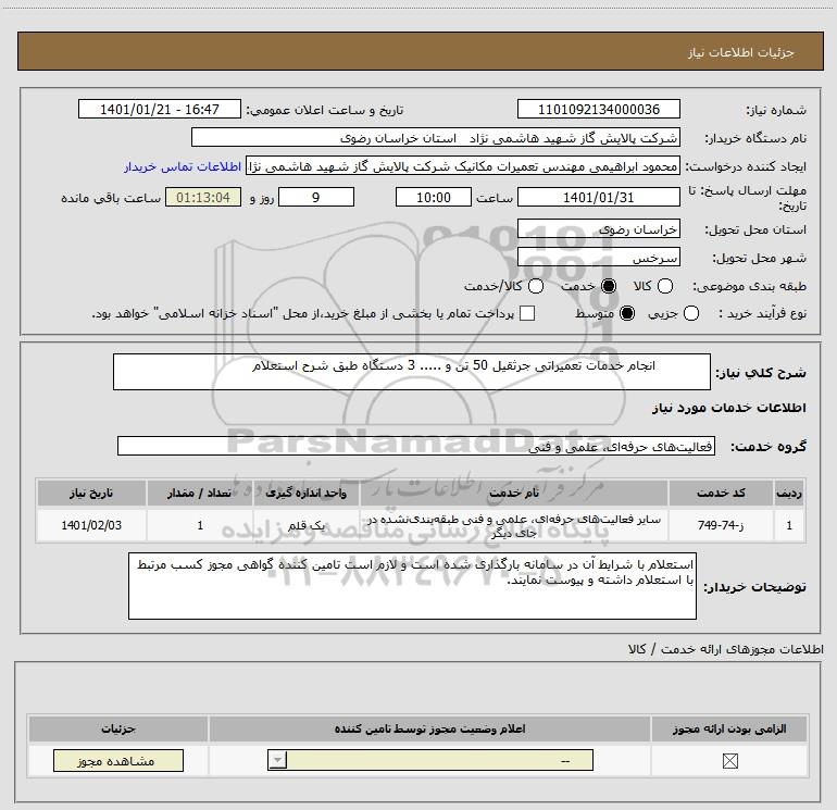 شرح کلی نیاز: انجام خدمات تعمیراتی جرثقیل 50 تن و ..... 3 دستگاه طبق شرح استعلام