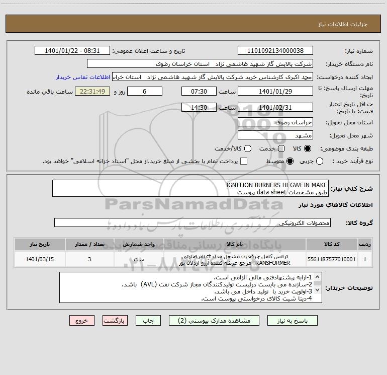 نام دستگاه خریدار:شرکت پالایش گاز شهید هاشمی نژاد استان خراسان رضوی