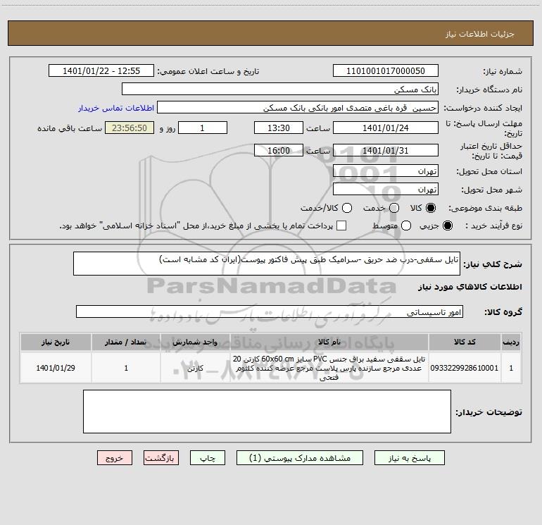 شرح کلی نیاز: تایل سقفی-درب ضد حریق -سرامیک طبق پیش فاکتور پیوست(ایران کد مشابه است)