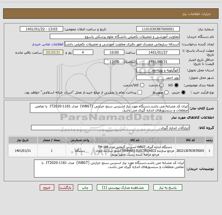 شرح کلی نیاز: ایران کد مشابه می باشد.دستگاه مورد نیاز استرس سنج حرارتی (WBGT) مدل JT2020-1161 با تمامی متعلقات و سنسورهای اندازه گیری می باشد.