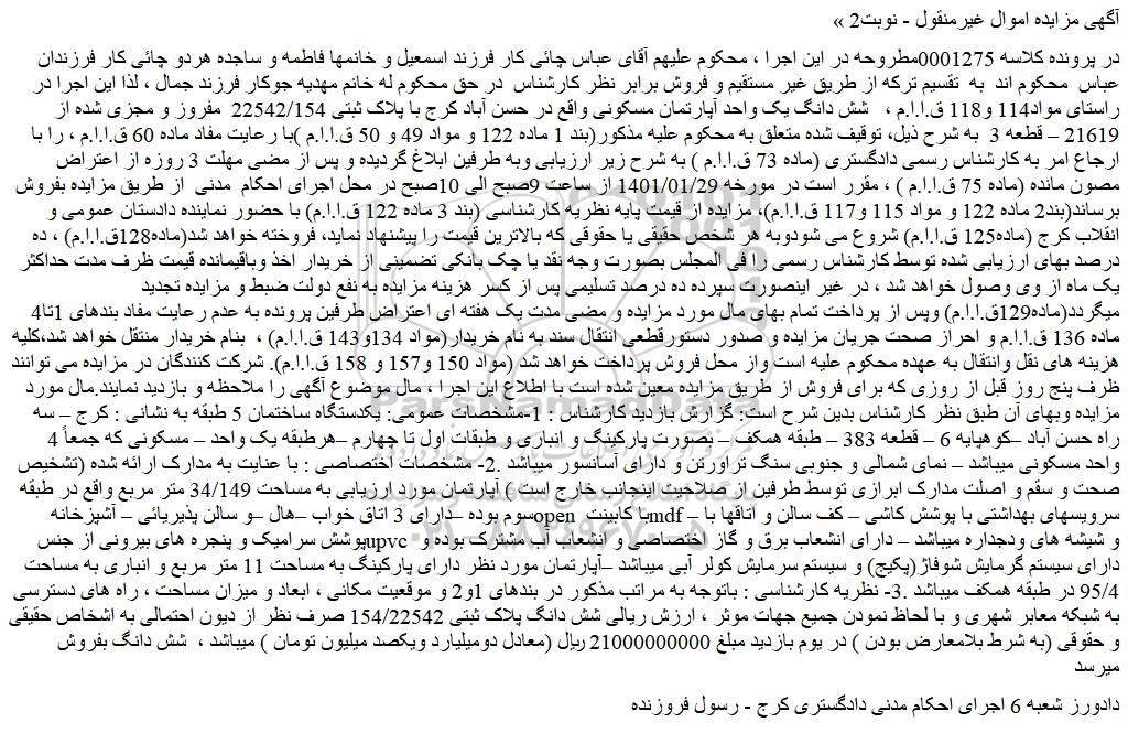 در پرونده کلاسه 0001275مطروحه در این اجرا ، محکوم علیهم آقای عباس چائی کار فرزند اسمعیل و خانمها فاطمه و ساجده هردو چائی کار فرزندان عباس  محکوم اند  به  تقسیم ترکه از طریق غیر مستقیم و فروش برابر نظر کارشناس  در حق محکوم له خانم مهدیه جوکار فرزند جمال ، لذا این اجرا در راستای مواد114 و118 ق.ا.ا.م ،   شش دانگ یک واحد آپارتمان مسکونی واقع در حسن آباد کرج با پلاک ثبتی 22542/154  مفروز و مجزی شده از 21619 – قطعه 3  به شرح ذیل، توقیف شده متعلق به محکوم علیه مذکور(بند 1 ماده 122 و مواد 49 و 50 ق.ا.ا.م )با رعایت مفاد ماده 60 ق.ا.ا.م ، را با ارجاع امر به کارشناس رسمی دادگستری (ماده 73 ق.ا.ا.م ) به شرح زیر ارزیابی وبه طرفین ابلاغ گردیده و پس از مضی مهلت 3 روزه از اعتراض مصون مانده (ماده 75 ق.ا.ا.م ) ، مقرر است در مورخه 1401/01/29 از ساعت 9صبح الی 10صبح در محل اجرای احکام  مدنی  از طریق مزایده بفروش برساند(بند2 ماده 122 و مواد 115 و117 ق.ا.ا.م)، مزایده از قیمت پایه نظریه کارشناسی (بند 3 ماده 122 ق.ا.ا.م) با حضور نماینده دادستان عمومی و انقلاب کرج (ماده125 ق.ا.ا.م) شروع می شودوبه هر شخص حقیقی یا حقوقی که بالاترین قیمت را پیشنهاد نماید، فروخته خواهد شد(ماده128ق.ا.ا.م) ، ده درصد بهای ارزیابی شده توسط کارشناس رسمی را فی المجلس بصورت وجه نقد یا چک بانکی تضمینی از خریدار اخذ وباقیمانده قیمت ظرف مدت حداکثر یک ماه از وی وصول خواهد شد ، در غیر اینصورت سپرده ده درصد تسلیمی پس از کسر هزینه مزایده به نفع دولت ضبط و مزایده تجدید میگردد(ماده129ق.ا.ا.م) وپس از پرداخت تمام بهای مال مورد مزایده و مضی مدت یک هفته ای اعتراض طرفین پرونده به عدم رعایت مفاد بندهای 1تا4 ماده 136 ق.ا.ا.م و احراز صحت جریان مزایده و صدور دستورقطعی انتقال سند به نام خریدار(مواد 134و143 ق.ا.ا.م) ،  بنام خریدار منتقل خواهد شد،کلیه هزینه های نقل وانتقال به عهده محکوم علیه است واز محل فروش پرداخت خواهد شد (مواد 150 و157 و 158 ق.ا.ا.م). شرکت کنندگان در مزایده می توانند ظرف پنج روز قبل از روزی که برای فروش از طریق مزایده معین شده است با اطلاع این اجرا ، مال موضوع آگهی را ملاحظه و بازدید نمایند.مال مورد مزایده وبهای آن طبق نظر کارشناس بدین شرح است: گزارش بازدید کارشناس : 1-مشخصات عمومی: یکدستگاه ساختمان 5 طبقه به نشانی : کرج – سه راه حسن آباد –کوهپایه 6 – قطعه 383 – طبقه همکف – بصورت پارکینگ و انباری و طبقات اول تا چهارم –هرطبقه یک واحد – مسکونی که جمعاً 4 واحد مسکونی میباشد – نمای شمالی و جنوبی سنگ تراورتن و دارای آسانسور میباشد .2- مشخصات اختصاصی : با عنایت به مدارک ارائه شده (تشخیص صحت و سقم و اصلت مدارک ابرازی توسط طرفین از صلاحیت اینجانب خارج است ) آپارتمان مورد ارزیابی به مساحت 34/149 متر مربع واقع در طبقه سوم بوده –دارای 3 اتاق خواب –هال –و سالن پذیریائی – آشپزخانه open با کابینت mdf – سرویسهای بهداشتی با پوشش کاشی – کف سالن و اتاقها با پوشش سرامیک و پنجره های بیرونی از جنس  upvc  و شیشه های ودجداره میباشد – دارای انشعاب برق و گاز اختصاصی و انشعاب آب مشترک بوده و دارای سیستم گرمایش شوفاژ(پکیج) و سیستم سرمایش کولر آبی میباشد –آپارتمان مورد نظر دارای پارکینگ به مساحت 11 متر مربع و انباری به مساحت 95/4 در طبقه همکف میباشد .3- نظریه کارشناسی : باتوجه به مراتب مذکور در بندهای 1و2 و موقعیت مکانی ، ابعاد و میزان مساحت ، راه های دسترسی به شبکه معابر شهری و با لحاظ نمودن جمیع جهات موثر ، ارزش ریالی شش دانگ پلاک ثبتی 154/22542 صرف نظر از دیون احتمالی به اشخاص حقیقی و حقوقی (به شرط بلامعارض بودن ) در یوم بازدید مبلغ 21000000000 ریال (معادل دومیلیارد ویکصد میلیون تومان ) میباشد ،  شش دانگ بفروش میرسد