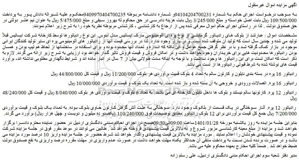 بنابراین جلسه مزایده به روز یکشنبه مورخه 1401/01/28ساعت 09:00الی09:30صبح در اجرای احکام مدنی دادگستری اردبیل در حضور نماینده محترم دادسرا برگزار خواهد شد و مزایده از مبلغ معینه کارشناسی مزبور شروع و به بالاترین قیمت پیشنهادی فروخته خواهد شد . طالبین می توانند در موعد مقرر فوق در جلسه مزایده شرکت نموده و قیمت پیشنهادی خودشان را اعلام نمایند . مورد مزایده به بالاترین قیمت پیشنهادی واگذار خواهد شد شرط حضور در جلسه مزایده واریز 10 درصد مورد مزایده می باشد و در صورت برنده شدن نسبت به پرداخت مابقی آن حداکثر یکماه مهلت خواهد داشت در صورت عدم واریزی در مهلت مقرره درصد واریزی به نفع صندوق دولت ضبط خواهد شد . ضمناً کلیه مخارج بعهده محکوم علیه می باشد.