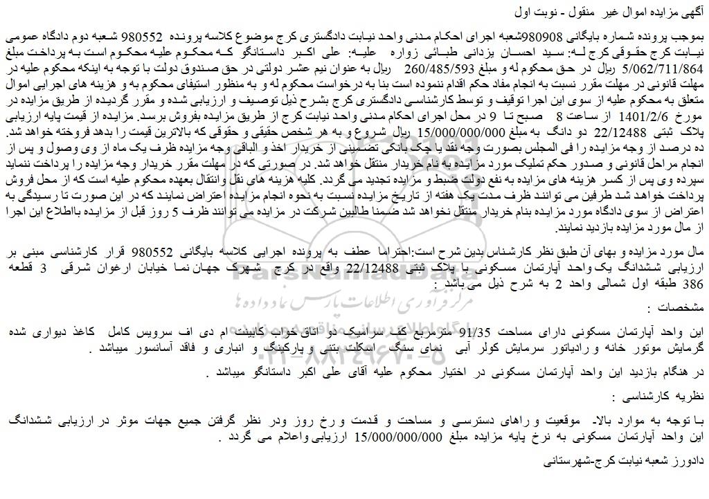 مال مورد مزایده و بهای آن طبق نظر کارشناس بدین شرح است:احتراما عطف به پرونده اجرایی کلاسه بایگانی 980552 قرار کارشناسی مبنی بر ارزیابی ششدانگ یک واحد آپارتمان مسکونی با پلاک ثبتی 22/12488 واقع در کرج شهرک جهان نما خیابان ارغوان شرقی 3 قطعه 386 طبقه اول شمالی واحد 2 به شرح ذیل می باشد :