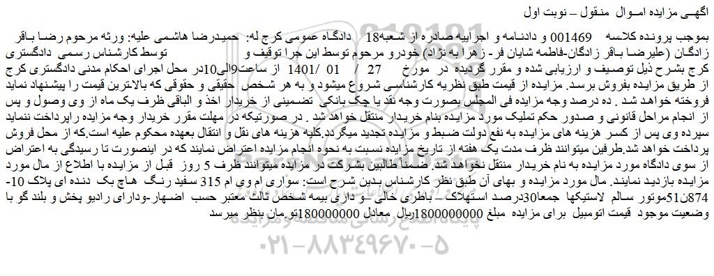 بموجب پرونده کلاسه    001469 و دادنامه و اجراییه صادره از شعبه18    دادگاه عمومی کرج له:  حمیدرضا هاشمی علیه: ورثه مرحوم رضا باقر زادگان (علیرضا باقر زادگان-فاطمه شایان فر- زهرا به نژاد) خودرو مرحوم توسط این جرا توقیف و                      توسط کارشناس رسمی  دادگستری کرج بشرح ذیل توصیف و ارزیابی شده و مقرر گردیده  در  مورخ      27  /    01  /1401  از ساعت9الی10در محل اجرای احکام مدنی دادگستری کرج از طریق مزایده بفروش برسد. مزایده از قیمت طبق نظریه کارشناسی شروع میشود و به هر شخص  حقیقی و حقوقی که بالاترین قیمت را پیشنهاد نماید فروخته خواهد شد . ده درصد وجه مزایده فی المجلس بصورت وجه نقد یا چک بانکی  تضمینی از خریدار اخذ و الباقی ظرف یک ماه از وی وصول و پس از انجام مراحل قانونی و صدور حکم تملیک مورد مزایده بنام خریدار منتقل خواهد شد . در صورتیکه در مهلت مقرر خریدار وجه مزایده راپرداخت ننماید سپرده وی پس از کسر هزینه های مزایده به نفع دولت ضبط و مزایده تجدید میگردد.کلیه هزینه های نقل و انتقال بعهده محکوم علیه است.که از محل فروش پرداخت خواهد شد.طرفین میتوانند ظرف مدت یک هفته از تاریخ مزایده نسبت به نحوه انجام مزایده اعتراض نمایند که در اینصورت تا رسیدگی به اعتراض از سوی دادگاه مورد مزایده به نام خریدار منتقل نخواهد شد. ضمناً طالبین بشرکت در مزایده میتوانند ظرف 5 روز  قبل از مزایده با اطلاع از مال مورد مزایده بازدید نمایند. مال مورد مزایده و بهای آن طبق نظر کارشناس بدین شرح است: سواری ام وی ام 315 سفید رنگ  هاچ بک  دنده ای پلاک 10-874ن51موتور سالم  لاستیکها  جمعا30درصد استهلاک – باطری خالی –و داری بیمه شخص ثالث معتبر حسب  اضهار-ودارای رادیو پخش و بلند گو با وضعیت موجود  قیمت اتومبیل  برای مزایده  مبلغ 1800000000ریال  معادل 180000000تو.مان بنظر میرسد