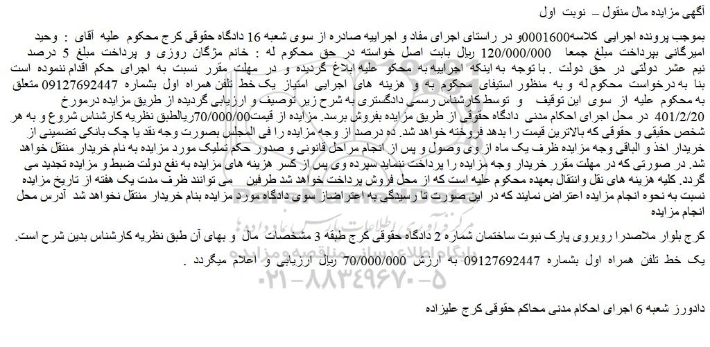 بموجب پرونده اجرایی  کلاسه0001600و در راستای اجرای مفاد و اجراییه صادره از سوی شعبه 16 دادگاه حقوقی کرج محکوم  علیه  آقای  :  وحید  امیرگانی  بپرداخت  مبلغ  جمعا    120/000/000  ریال  بابت  اصل  خواسته  در  حق  محکوم  له  :  خانم  مژگان  روزی  و  پرداخت  مبلغ  5  درصد  نیم  عشر  دولتی  در  حق  دولت  . با توجه  به اینکه  اجراییه به  محکو  علیه ابلاغ  گردیده  و  در  مهلت  مقرر  نسبت  به  اجرای  حکم  اقدام ننموده  است  بنا  به درخواست  محکوم له  و به  منظور استیفای  محکوم  به  و  هزینه  های  اجرایی  امتیاز  یک خط  تلفن همراه  اول  بشماره  09127692447 متعلق  به محکوم  علیه  از  سوی  این توقیف    و  توسط کارشناس رسمی دادگستری به شرح زیر توصیف و ارزیابی گردیده از طریق مزایده درمورخ 401/2/20  در محل اجرای احکام مدنی  دادگاه حقوقی از طریق مزایده بفروش برسد. مزایده از قیمت70/000/00ریالطبق نظریه کارشناس شروع و به هر شخص حقیقی و حقوقی که بالاترین قیمت را بدهد فروخته خواهد شد. ده درصد از وجه مزایده را فی المجلس بصورت وجه نقد یا چک بانکی تضمینی از خریدار اخذ و الباقی وجه مزایده ظرف یک ماه از وی وصول و پس از انجام مراحل قانونی و صدور حکم تملیک مورد مزایده به نام خریدار منتقل خواهد شد. در صورتی که در مهلت مقرر خریدار وجه مزایده را پرداخت ننماید سپرده وی پس از کسر هزینه های مزایده به نفع دولت ضبط و مزایده تجدید می گردد. کلیه هزینه های نقل وانتقال بعهده محکوم علیه است که از محل فروش پرداخت خواهد شد طرفین    می توانند ظرف مدت یک هفته از تاریخ مزایده نسبت به نحوه انجام مزایده اعتراض نمایند که در این صورت تا رسیدگی به اعتراضاز سوی دادگاه مورد مزایده بنام خریدار منتقل نخواهد شد  آدرس محل انجام مزایده