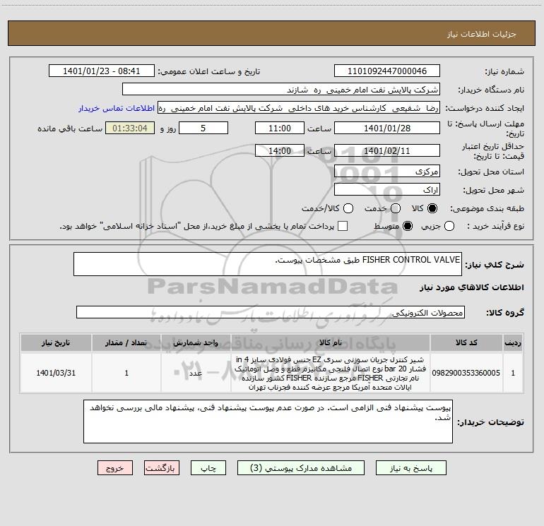 شرح کلی نیاز: FISHER CONTROL VALVE طبق مشخصات پیوست.