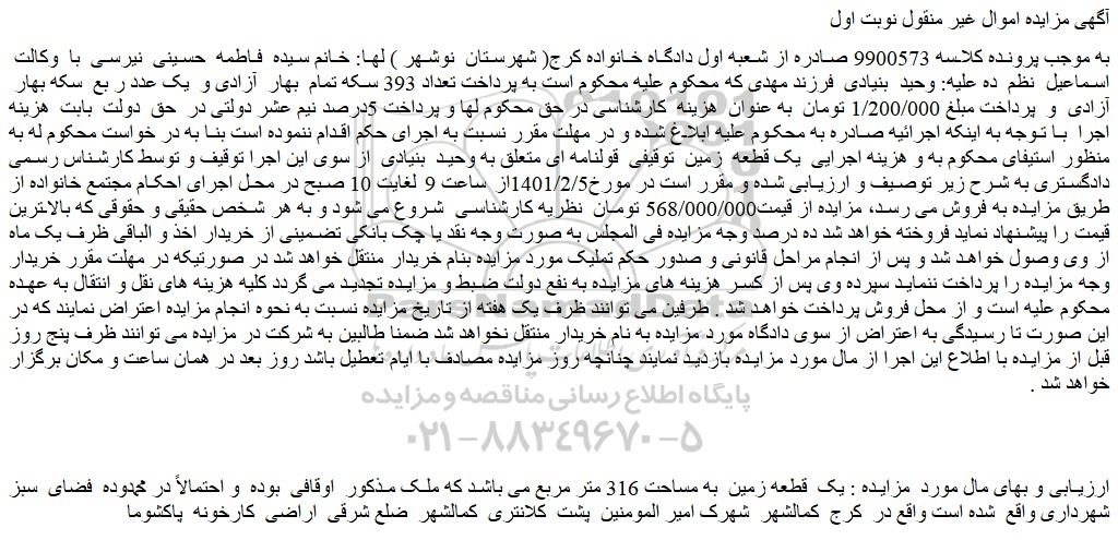 به موجب پرونده کلاسه 9900573 صادره از شعبه اول دادگاه خانواده کرج( شهرستان نوشهر ) لها: خانم سیده فاطمه حسینی نیرسی با وکالت اسماعیل نظم ده علیه: وحید بنیادی فرزند مهدی که محکوم علیه محکوم است به پرداخت تعداد 393 سکه تمام بهار آزادی و یک عدد ر بع سکه بهار آزادی و پرداخت مبلغ 1/200/000 تومان به عنوان هزینه کارشناسی در حق محکوم لها و پرداخت 5درصد نیم عشر دولتی در حق دولت بابت هزینه اجرا با توجه به اینکه اجرائیه صادره به محکوم علیه ابلاغ شده و در مهلت مقرر نسبت به اجرای حکم اقدام ننموده است بنا به در خواست محکوم له به منظور استیفای محکوم به و هزینه اجرایی یک قطعه زمین توقیفی قولنامه ای متعلق به وحید بنیادی از سوی این اجرا توقیف و توسط کارشناس رسمی دادگستری به شرح زیر توصیف و ارزیابی شده و مقرر است در مورخ1401/2/5از ساعت 9 لغایت 10 صبح در محل اجرای احکام مجتمع خانواده از طریق مزایده به فروش می رسد، مزایده از قیمت568/000/000 تومان نظریه کارشناسی شروع می شود و به هر شخص حقیقی و حقوقی که بالاترین قیمت را پیشنهاد نماید فروخته خواهد شد ده درصد وجه مزایده فی المجلس به صورت وجه نقد یا چک بانکی تضمینی از خریدار اخذ و الباقی ظرف یک ماه از وی وصول خواهد شد و پس از انجام مراحل قانونی و صدور حکم تملیک مورد مزایده بنام خریدار منتقل خواهد شد در صورتیکه در مهلت مقرر خریدار وجه مزایده را پرداخت ننماید سپرده وی پس از کسر هزینه های مزایده به نفع دولت ضبط و مزایده تجدید می گردد کلیه هزینه های نقل و انتقال به عهده محکوم علیه است و از محل فروش پرداخت خواهد شد . طرفین می توانند ظرف یک هفته از تاریخ مزایده نسبت به نحوه انجام مزایده اعتراض نمایند که در این صورت تا رسیدگی به اعتراض از سوی دادگاه مورد مزایده به نام خریدار منتقل نخواهد شد ضمنا طالبین به شرکت در مزایده می توانند ظرف پنج روز قبل از مزایده با اطلاع این اجرا از مال مورد مزایده بازدید نمایند چنانچه روز مزایده مصادف با ایام تعطیل باشد روز بعد در همان ساعت و مکان برگزار خواهد شد .