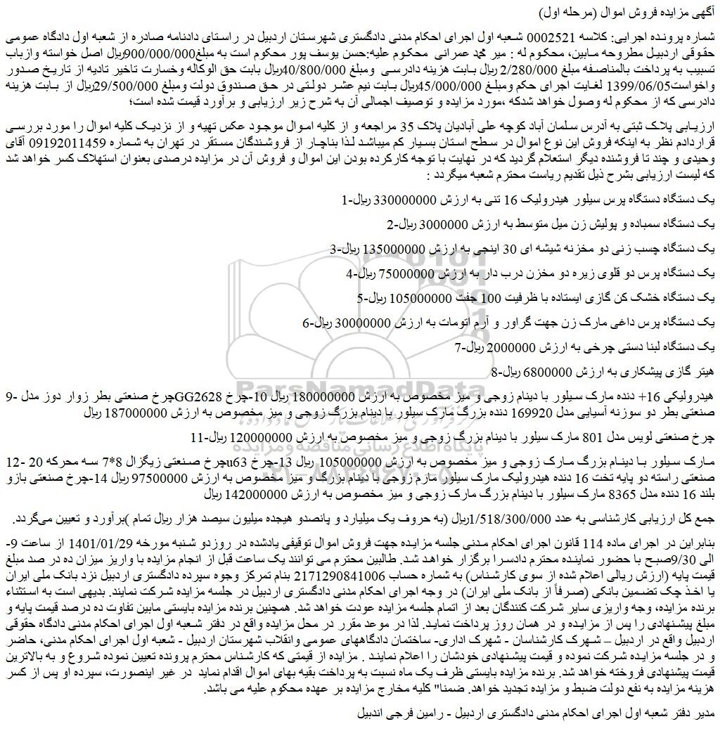 شماره پرونده اجرایی: کلاسه 0002521 شعبه اول اجرای احکام مدنی دادگستری شهرستان اردبیل در راستای دادنامه صادره از شعبه اول دادگاه عمومی حقوقی اردبیل مطروحه مابین، محکوم له : میر محمد عمرانی محکوم علیه:حسن یوسف پور محکوم است به مبلغ900/000/000ریال اصل خواسته وازباب تسبیب به پرداخت بالمناصفه مبلغ 2/280/000 ریال بابت هزینه دادرسی ومبلغ 40/800/000ریال بابت حق الوکاله وخسارت تاخیر تادیه از تاریخ صدور واخواست1399/06/05 لغایت اجرای حکم ومبلغ 45/000/000ریال بابت نیم عشر دولتی در حق صندوق دولت ومبلغ 29/500/000ریال از بابت هزینه دادرسی که از محکوم له وصول خواهد شدکه ،مورد مزایده و توصیف اجمالی آن به شرح زیر ارزیابی و برآورد قیمت شده است؛