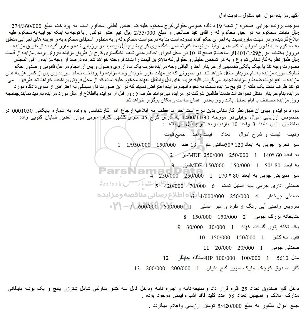 بموجب پرونده اجرایی  صادره از شعبه 19 دادگاه عمومی حقوقی کرج محکوم علیه ک  عباس  لطفی  محکوم  است  به  پرداخت  مبلغ  274/360/000  ریال  بابات  محکوم  به  در  حق  محکوم  له  :  آقای  محمد  صالحی  و  مبلغ  2/55/000  ریال  نیم  عشر  دولتی  . با توجه به اینکه اجراییه به محکوم علیه ابلاغ گردیده و در مهلت مقررنسبت به اجرای حکم اقدام ننموده است بنا به درخواست محکوم له و به منظور استیفای محکوم به و هزینه های اجرایی متعلق به محکوم علیه قانون اجرای احکام مدنی توقیف و توسط کارشناسی دادگستری کرج بشرح ذیل توصیف و ارزیابی شده و مقرر گردیده از طریق مزایده درروز یکشنبه مورخ1401/1/29از ساعت9 صبح تا  10 در محل اجرای احکام مدنی شعبه دادگستری کرج از طریق مزایده بفروش برسد. مزایده از قیمت ریال طبق نظریه کارشناس شروع و به هر شخص حقیقی و حقوقی که بالاترین قیمت را بدهد فروخته خواهد شد. ده درصد از وجه مزایده را فی المجلس بصورت وجه نقد یا چک بانکی تضمینی از خریدار اخذ و الباقی وجه مزایده ظرف یک ماه از وی وصول و پس از انجام مراحل قانونی و صدور حکم تملیک مورد مزایده به نام خریدار منتقل خواهد شد. در صورتی که در مهلت مقرر خریدار وجه مزایده را پرداخت ننماید سپرده وی پس از کسر هزینه های مزایده به نفع دولت ضبط و مزایده تجدید می گردد. کلیه هزینه های نقل وانتقال بعهده محکوم علیه است که از محل فروش پرداخت خواهد شد طرفین    می توانند ظرف مدت یک هفته از تاریخ مزایده نسبت به نحوه انجام مزایده اعتراض نمایند که در این صورت تا رسیدگی به اعتراض از سوی دادگاه مورد مزایده بنام خریدار منتقل نخواهد شد ضمنا طالبین شرکت در مزایده می توانند ظرف 5 روز قبل از مزایده بااطلاع از مال مورد مزایده بازدید نمایند.چنانجه روز مزایده مصادف با ایام تعطیل باشد روز بعددر  همان ساعت و مکان برگزار خواهد شد