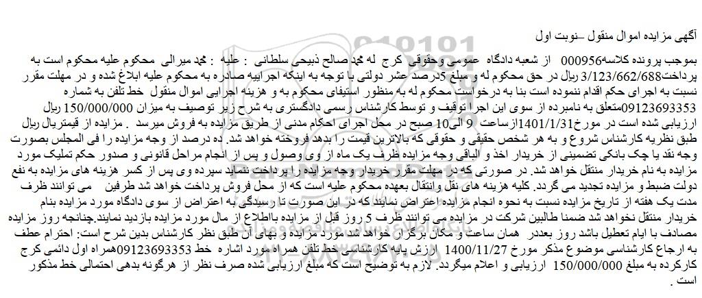 بموجب پرونده کلاسه000956 از شعبه دادگاه عمومی وحقوقی کرج له محمد صالح ذبیحی سلطانی : علیه : محمد میرالی محکوم علیه محکوم است به پرداخت3/123/662/688 ریال در حق محکوم له و مبلغ 5درصد عشر دولتی با توجه به اینکه اجراییه صادره به محکوم علیه ابلاغ شده و در مهلت مقرر نسبت به اجرای حکم اقدام ننموده است بنا به درخواست محکوم له به منظور استیفای محکوم به و هزینه اجرایی اموال منقول خط تلفن به شماره 09123693353متعلق به نامبرده از سوی این اجرا توقیف و توسط کارشناس رسمی دادگستری به شرح زیر توصیف به میزان 150/000/000 ریال ارزیابی شده است در مورخ1401/1/31ازساعت 9 الی10 صبح در محل اجرای احکام مدنی از طریق مزایده به فروش میرسد . مزایده از قیمتریال ریال طبق نظریه کارشناس شروع و به هر شخص حقیقی و حقوقی که بالاترین قیمت را بدهد فروخته خواهد شد. ده درصد از وجه مزایده را فی المجلس بصورت وجه نقد یا چک بانکی تضمینی از خریدار اخذ و الباقی وجه مزایده ظرف یک ماه از وی وصول و پس از انجام مراحل قانونی و صدور حکم تملیک مورد مزایده به نام خریدار منتقل خواهد شد. در صورتی که در مهلت مقرر خریدار وجه مزایده را پرداخت ننماید سپرده وی پس از کسر هزینه های مزایده به نفع دولت ضبط و مزایده تجدید می گردد. کلیه هزینه های نقل وانتقال بعهده محکوم علیه است که از محل فروش پرداخت خواهد شد طرفین می توانند ظرف مدت یک هفته از تاریخ مزایده نسبت به نحوه انجام مزایده اعتراض نمایند که در این صورت تا رسیدگی به اعتراض از سوی دادگاه مورد مزایده بنام خریدار منتقل نخواهد شد ضمنا طالبین شرکت در مزایده می توانند ظرف 5 روز قبل از مزایده بااطلاع از مال مورد مزایده بازدید نمایند.چنانجه روز مزایده مصادف با ایام تعطیل باشد روز بعددر همان ساعت و مکان برگزار خواهد شد مورد مزایده و بهای آن طبق نظر کارشناس بدین شرح است: احترام عطف به ارجاع کارشناسی موضوع مذکر مورخ 1400/11/27 ارزش پایه کارشناسی خط تلفن همراه مورد اشاره خط 09123693353همراه اول دائمی کرج کارکرده به مبلغ 150/000/000 ارزیابی و اعلام میگردد. لازم به توضیح است که مبلغ ارزیابی شده صرف نظر از هرگونه بدهی احتمالی خط مذکور است .