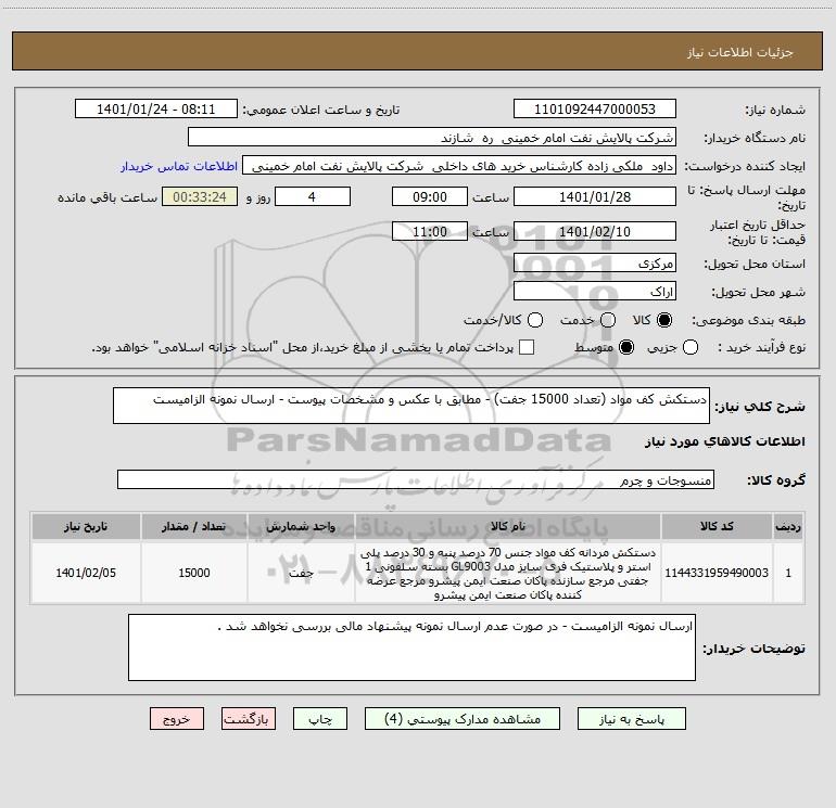 شرح کلی نیاز: دستکش کف مواد (تعداد 15000 جفت) - مطابق با عکس و مشخصات پیوست - ارسال نمونه الزامیست