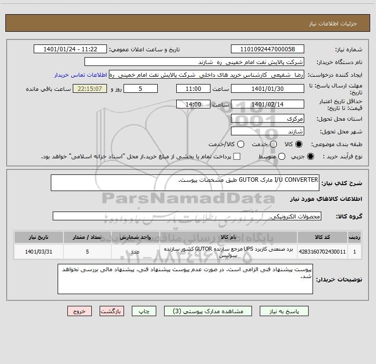 شرح کلی نیاز: I/U CONVERTER مارک GUTOR طبق مشخصات پیوست.