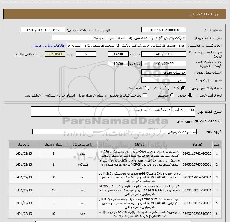 نام دستگاه خریدار:شرکت پالایش گاز شهید هاشمی نژاد استان خراسان رضوی