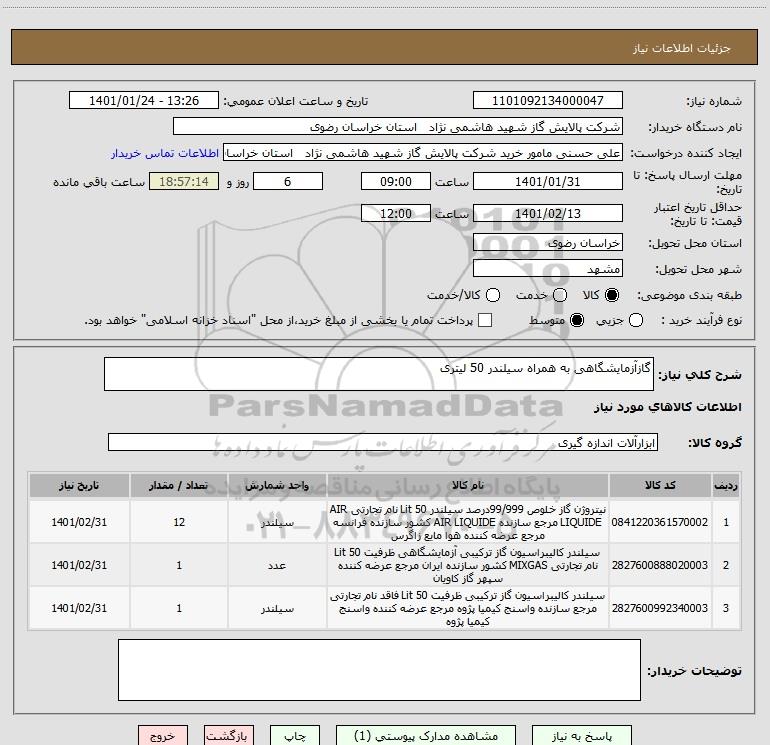 استعلام گازآزمایشگاهی به همراه سیلندر 50 لیتری, استعلام گازآزمایشگاهی به همراه سیلندر 50 لیتری