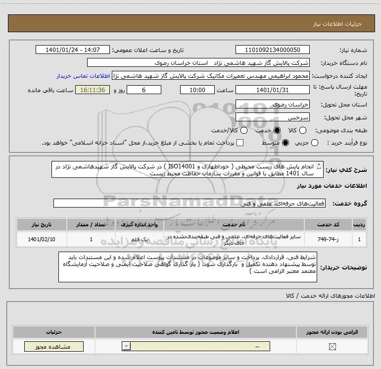 شرح کلی نیاز: انجام پایش های زیست محیطی ( خوداظهاری و ISO14001 ) در شرکت پالایش گاز شهیدهاشمی نژاد در سال 1401 مطابق با قوانین و مقررات سازمان حفاظت محیط زیست