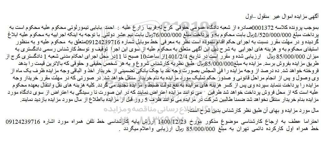 بموجب پرونده کلاسه 0001372صادره از شعبه دادگاه عمومی حقوقی کرج له:فریبا زارع علیه : احمد بابایی تیمورلوئی محکوم علیه محکوم است به پرداخت مبلغ 1/520/000/000ریال بابت محکوم به و پرداخت مبلغ 76/000/000ریال بابت نیم عشر دولتی. با توجه به اینکه اجراییه به محکوم علیه ابلاغ گردیده و در مهلت مقرر نسبت به اجرای حکم اقدام ننموده است نظر به معرفی خط موبایل شماره 09124239716متعلق به محکوم علیه و به منظور استیفای محکوم به و هزینه های اجرایی به شرح ذیل این آگهی متعلق به محکوم علیه از سوی این اجرا توقیف و توسط کارشناس رسمی دادگستری به میزان 85/000/000 ریال ارزیابی شده و مقرر است در تاریخ 1401/2/4از ساعت10 صبح تا 11در محل اجرای احکام مدنی شعبه 1 دادگستری کرج از طریق مزایده بفروش برسد. مزایده به مبلغ85/000/000ریال طبق نظریه کارشناس شروع و به هر شخص حقیقی و حقوقی که بالاترین قیمت را بدهد فروخته خواهد شد. ده درصد از وجه مزایده را فی المجلس بصورت وجه نقد یا چک بانکی تضمینی از خریدار اخذ و الباقی وجه مزایده ظرف یک ماه از وی وصول و پس از انجام مراحل قانونی و صدور حکم تملیک مورد مزایده به نام خریدار منتقل خواهد شد. در صورتی که در مهلت مقرر خریدار وجه مزایده را پرداخت ننماید سپرده وی پس از کسر هزینه های مزایده به نفع دولت ضبط و مزایده تجدید می گردد. کلیه هزینه های نقل وانتقال بعهده محکوم علیه است که از محل فروش پرداخت خواهد شد طرفین می توانند مزایده اعتراض نمایند که در این صورت تا رسیدگی به اعتراض از سوی دادگاه مورد مزایده بنام خریدار منتقل نخواهد شد ضمنا طالبین شرکت در مزایده می توانند ظرف 5 روز قبل از مزایده بااطلاع از مال مورد مزایده بازدید نمایند.