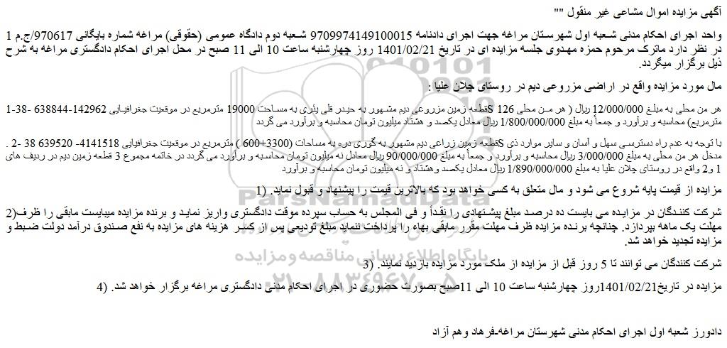 واحد اجرای احکام مدنی شعبه اول شهرستان مراغه جهت اجرای دادنامه 9709974149100015 شعبه دوم دادگاه عمومی (حقوقی) مراغه شماره بایگانی 970617/ج.م 1 در نظر دارد ماترک مرحوم حمزه مهدوی جلسه مزایده ای در تاریخ 1401/02/21 روز چهارشنبه ساعت 10 الی 11 صبح در محل اجرای احکام دادگستری مراغه به شرح ذیل برگزار میگردد.