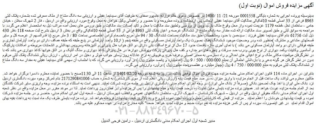 بنابراین در اجرای ماده 114 قانون اجرای احکام مدنی جلسه مزایده جهت فروش اموال توقیفی یادشده در روزسه شنبه مورخه 1401/02/20 از ساعت 11 الی 11:30صبح با حضور نماینده محترم دادسرا برگزار خواهد شد. طالبین محترم می توانند یک ساعت قبل از انجام مزایده با واریز میزان ده در صد مبلغ قیمت پایه (ارزش ریالی اعلام شده از سوی کارشناس) به شماره حساب 2171290841006 بنام تمرکز وجوه سپرده دادگستری اردبیل نزد بانک ملی ایران یا اخذ چک تضمین بانکی (صرفاً از بانک ملی ایران) در وجه اجرای احکام مدنی دادگستری اردبیل در جلسه مزایده شرکت نمایند. بدیهی است به استثناء برنده مزایده، وجه واریزی سایر شرکت کنندگان بعد از اتمام جلسه مزایده عودت خواهد شد. همچنین برنده مزایده بایستی مابین تفاوت ده درصد قیمت پایه و مبلغ پیشنهادی را پس از مزایده و در همان روز پرداخت نماید. لذا در موعد مقرر در محل مزایده واقع در دفتر شعبه اول اجرای احکام مدنی دادگاه حقوقی اردبیل واقع در اردبیل – شهرک کارشناسان - شهرک اداری- ساختمان دادگاههای عمومی وانقلاب شهرستان اردبیل - شعبه اول اجرای احکام مدنی، حاضر و در جلسه مزایده شرکت نموده و قیمت پیشنهادی خودشان را اعلام نمایند . مزایده از قیمتی که کارشناس محترم پرونده تعیین نموده شروع و به بالاترین قیمت پیشنهادی فروخته خواهد شد. برنده مزایده بایستی ظرف یک ماه نسبت به پرداخت بقیه بهای اموال اقدام نماید در غیر اینصورت، سپرده او پس از کسر هزینه مزایده به نفع دولت ضبط و مزایده تجدید خواهد. ضمنا" کلیه مخارج مزایده بر عهده محکوم علیه می باشد.