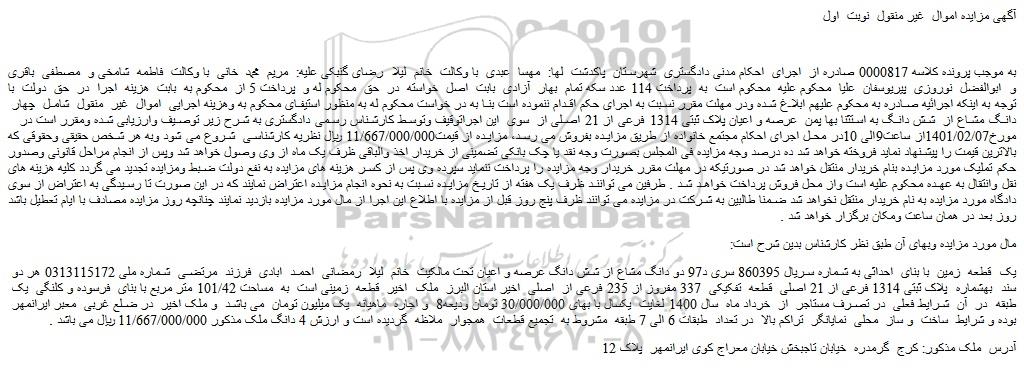 به موجب پرونده کلاسه 0000817 صادره از اجرای احکام مدنی دادگستری شهرستان پاکدشت لها: مهسا عبدی با وکالت خانم لیلا رضای گنبکی علیه: مریم محمد خانی با وکالت فاطمه شامخی و مصطفی باقری و ابوالفضل نوروزی پیریوسفان علیا محکوم علیه محکوم است به پرداخت 114 عدد سکه تمام بهار آزادی بابت اصل خواسته در حق محکوم له و پرداخت 5 از محکوم به بابت هزینه اجرا در حق دولت با توجه به اینکه اجرائیه صادره به محکوم علیهم ابلاغ شده ودر مهلت مقرر نسبت به اجرای حکم اقدام ننموده است بنا به در خواست محکوم له به منظور استیفای محکوم به وهزینه اجرایی اموال غیر منقول شامل چهار دانگ مشاع از شش دانگ به استثنا بها پمن عرصه و اعیان پلاک ثبتی 1314 فرعی از 21 اصلی از سوی این اجراتوقیف وتوسط کارشناس رسمی دادگستری به شرح زیر توصیف وارزیابی شده ومقرر است در مورخ1401/02/07از ساعت9الی 10در محل اجرای احکام مجتمع خانواده از طریق مزایده بفروش می رسد، مزایده از قیمت11/667/000/000 ریال نظریه کارشناسی شروع می شود وبه هر شخص حقیقی وحقوقی که بالاترین قیمت را پیشنهاد نماید فروخته خواهد شد ده درصد وجه مزایده فی المجلس بصورت وجه نقد یا چک بانکی تضمینی از خریدار اخذ والباقی ظرف یک ماه از وی وصول خواهد شد وپس از انجام مراحل قانونی وصدور حکم تملیک مورد مزایده بنام خریدار منتقل خواهد شد در صورتیکه در مهلت مقرر خریدار وجه مزایده را پرداخت ننماید سپرده وی پس از کسر هزینه های مزایده به نفع دولت ضبط ومزایده تجدید می گردد کلیه هزینه های نقل وانتقال به عهده محکوم علیه است واز محل فروش پرداخت خواهد شد . طرفین می توانند ظرف یک هفته از تاریخ مزایده نسبت به نحوه انجام مزایده اعتراض نمایند که در این صورت تا رسیدگی به اعتراض از سوی دادگاه مورد مزایده به نام خریدار منتقل نخواهد شد ضمنا طالبین به شرکت در مزایده می توانند ظرف پنج روز قبل از مزایده با اطلاع این اجرا از مال مورد مزایده بازدید نمایند چنانچه روز مزایده مصادف با ایام تعطیل باشد روز بعد در همان ساعت ومکان برگزار خواهد شد .
