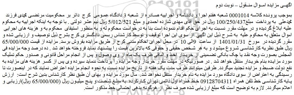 بموجب پرونده کلاسه 0001014 شعبه هفتم اجرا و دادنامه و اجراییه صادره از شعبه 3 دادگاه عمومی  کرج  دائر بر محکومیت مرتضی محمدی فرزند محمدعلی  به پرداخت  مبلغ100/250/437 ریال در حق آقای مهدی شازده احمدی و مبلغ 5/012/521 ریال نیم عشر دولتی . با توجه به اینکه اجراییه به محکوم علیه ابلاغ گردیده و در مهلت مقرر نسبت به اجرای حکم اقدام ننموده است بنا به درخواست محکوم له و به منظور استیفای  محکوم به و هزینه های اجرایی  اموال متعلق به محکوم علیه  به شرح ذیل این اگهی  از سوی این اجرا توقیف و توسط کارشناس رسمی دادگستری کرج بشرح ذیل توصیف و ارزیابی شده و مقرر گردیده در  مورخ  1401/01/31  از ساعت  9الی 10  در محل اجرای احکام مدنی کرج از طریق مزایده بفروش برسد. مزایده از قیمت 65/000/000 ریال طبق نظریه کارشناسی شروع میشود و به هر شخص حقیقی و حقوقی که بالاترین قیمت را پیشنهاد نماید فروخته خواهد شد . ده درصد وجه مزایده فی المجلس بصورت وجه نقد یا چک بانکی تضمینی از خریدار اخذ و الباقی ظرف یک ماه از وی وصول و پس از انجام مراحل قانونی و صدور حکم تملیک مورد مزایده بنام خریدار منتقل خواهد شد . در صورتیکه در مهلت مقرر خریدار وجه مزایده را پرداخت ننماید سپرده وی پس از کسر هزینه های مزایده به نفع دولت ضبط و مزایده تجدید میگردد. طرفین میتوانند ظرف مدت یک هفته از تاریخ مزایده نسبت به نحوه انجام مزایده اعتراض نمایند که در اینصورت تا رسیدگی به اعتراض از سوی دادگاه مورد مزایده به نام خریدار منتقل نخواهد شد.  مال مورد مزایده و بهای آن طبق نظر کارشناس بدین شرح است:  ارزش پایه کارشناسی خط تلفن همراه 09128704311 خط همراه اول دائمی تهران کارکرده  به مبلغ شصت و پنج میلیون ریال (65/000/000 ریال)ارزیابی و اعلام میگردد. لازم به توضیح است که مبلغ ارزیابی شده صرف نظر از هرگونه بدهی احتمالی خط مذکور است.