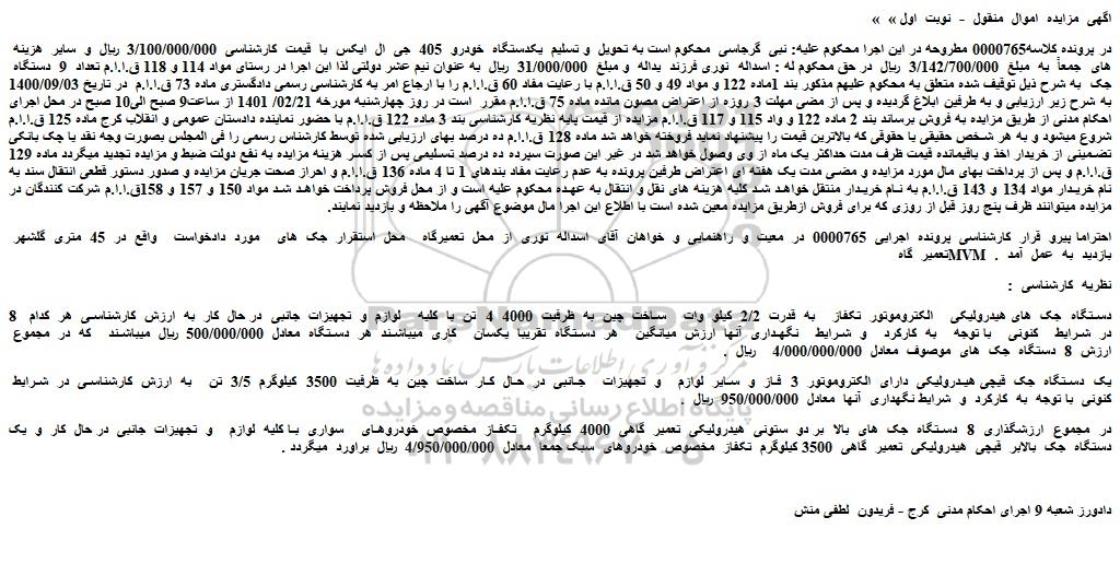 در پرونده کلاسه0000765 مطروحه در این اجرا محکوم علیه: نبی گرجاسی محکوم است به تحویل و تسلیم یکدستگاه خودرو 405 جی ال ایکس با قیمت کارشناسی 3/100/000/000 ریال و سایر هزینه های جمعاً به مبلغ 3/142/700/000 ریال در حق محکوم له : اسداله نوری فرزند یداله و مبلغ 31/000/000 ریال به عنوان نیم عشر دولتی لذا این اجرا در رستای مواد 114 و 118 ق.ا.ا.م تعداد 9 دستگاه جک به شرح ذیل توقیف شده متعلق به محکوم علیهم مذکور بند 1ماده 122 و مواد 49 و 50 ق.ا.ا.م با رعایت مفاد 60 ق.ا.ا.م را با ارجاع امر به کارشناسی رسمی دادگستری ماده 73 ق.ا.ا.م در تاریخ 1400/09/03 به شرح زیر ارزیابی و به طرفین ابلاغ گردیده و پس از مضی مهلت 3 روزه از اعتراض مصون مانده ماده 75 ق.ا.ا.م مقرر است در روز چهارشنبه مورخه 02/21/ 1401 از ساعت9 صبح الی10 صبح در محل اجرای احکام مدنی از طریق مزایده به فروش برساند بند 2 ماده 122 و واد 115 و 117 ق.ا.ا.م مزایده از قیمت پایه نظریه کارشناسی بند 3 ماده 122 ق.ا.ا.م با حضور نماینده دادستان عمومی و انقلاب کرج ماده 125 ق.ا.ا.م شروع میشود و به هر شخص حقیقی یا حقوقی که بالاترین قیمت را پیشنهاد نماید فروخته خواهد شد ماده 128 ق.ا.ا.م ده درصد بهای ارزیابی شده توسط کارشناس رسمی را فی المجلس بصورت وجه نقد یا چک بانکی تضمینی از خریدار اخذ و باقیمانده قیمت ظرف مدت حداکثر یک ماه از وی وصول خواهد شد در غیر این صورت سپرده ده درصد تسلیمی پس از کسر هزینه مزایده به نفع دولت ضبط و مزایده تجدید میگردد ماده 129 ق.ا.ا.م و پس از پرداخت بهای مال مورد مزایده و مضی مدت یک هفته ای اعتراض طرفین پرونده به عدم رعایت مفاد بندهای 1 تا 4 ماده 136 ق.ا.ا.م و احراز صحت جریان مزایده و صدور دستور قطعی انتقال سند به نام خریدار مواد 134 و 143 ق.ا.ا.م به نام خریدار منتقل خواهد شد کلیه هزینه های نقل و انتقال به عهده محکوم علیه است و از محل فروش پرداخت خواهد شد مواد 150 و 157 و 158ق.ا.ا.م شرکت کنندگان در مزایده میتوانند ظرف پنج روز قبل از روزی که برای فروش ازطریق مزایده معین شده است با اطلاع این اجرا مال موضوع آگهی را ملاحظه و بازدید نمایند.