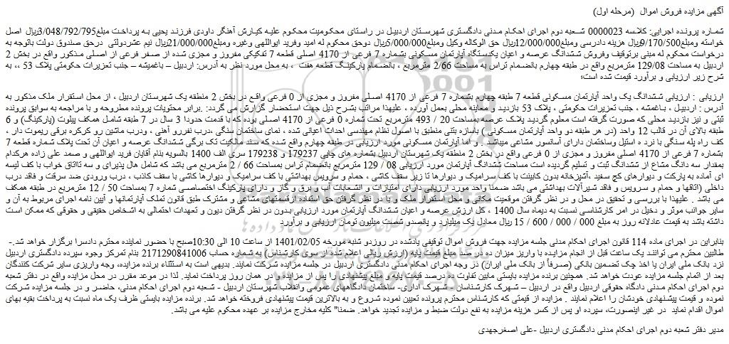 شماره پرونده اجرایی: کلاسه 0000023 شعبه دوم اجرای احکام مدنی دادگستری شهرستان اردبیل در راستای محکومیت محکوم علیه کیارش آهنگر داودی فرزند یحیی به پرداخت مبلغ3/048/792/795ریال اصل خواسته ومبلغ9/170/500ریال هزینه دادرسی ومبلغ12/000/000ریال حق الوکاله وکیل ومبلغ5/000/000ریال دوحق محکوم له امید وفرید ایواللهی وغیره ومبلغ21/000/000ریال نیم عشردولتی درحق صندوق دولت باتوجه به درخواست محکوم له مبنی برتوقیف وفروش ششدانگ عرصه و اعیان یکدستگاه آپارتمان مسکونی بشماره 7 فرعی از 4170 اصلی قطعه 7 تفکیکی مفروز و مجزی شده از صفر فرعی از اصلی مذکور واقع در بخش 2 اردبیل به مساحت 129/08 مترمربع واقع در طبقه چهارم بانضمام تراس به مساحت 2/66 مترمربع ، بانضمام پارکینگ قطعه هفت ، به محل مورد نظر به آدرس: اردبیل – باغمیشه – جنب تعزیرات حکومتی پلاک 53 ،، به شرح زیر ارزیابی و برآورد قیمت شده است؛