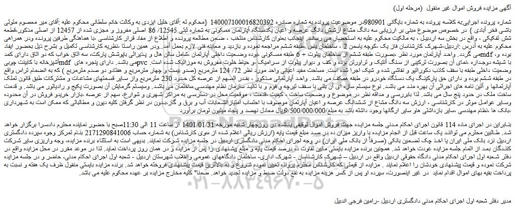 بنابراین در اجرای ماده 114 قانون اجرای احکام مدنی جلسه مزایده جهت فروش اموال توقیفی یادشده در روزچهار شنبه مورخه 1401/01/31 از ساعت 11 الی 11:30صبح با حضور نماینده محترم دادسرا برگزار خواهد شد. طالبین محترم می توانند یک ساعت قبل از انجام مزایده با واریز میزان ده در صد مبلغ قیمت پایه (ارزش ریالی اعلام شده از سوی کارشناس) به شماره حساب 2171290841006 بنام تمرکز وجوه سپرده دادگستری اردبیل نزد بانک ملی ایران یا اخذ چک تضمین بانکی (صرفاً از بانک ملی ایران) در وجه اجرای احکام مدنی دادگستری اردبیل در جلسه مزایده شرکت نمایند. بدیهی است به استثناء برنده مزایده، وجه واریزی سایر شرکت کنندگان بعد از اتمام جلسه مزایده عودت خواهد شد. همچنین برنده مزایده بایستی مابین تفاوت ده درصد قیمت پایه و مبلغ پیشنهادی را پس از مزایده و در همان روز پرداخت نماید. لذا در موعد مقرر در محل مزایده واقع در دفتر شعبه اول اجرای احکام مدنی دادگاه حقوقی اردبیل واقع در اردبیل – شهرک کارشناسان - شهرک اداری- ساختمان دادگاههای عمومی وانقلاب شهرستان اردبیل - شعبه اول اجرای احکام مدنی، حاضر و در جلسه مزایده شرکت نموده و قیمت پیشنهادی خودشان را اعلام نمایند . مزایده از قیمتی که کارشناس محترم پرونده تعیین نموده شروع و به بالاترین قیمت پیشنهادی فروخته خواهد شد. برنده مزایده بایستی منقول ظرف یک هفته و نسبت به پرداخت بقیه بهای اموال اقدام نماید در غیر اینصورت، سپرده او پس از کسر هزینه مزایده به نفع دولت ضبط و مزایده تجدید خواهد. ضمنا" کلیه مخارج مزایده بر عهده محکوم علیه می باشد.