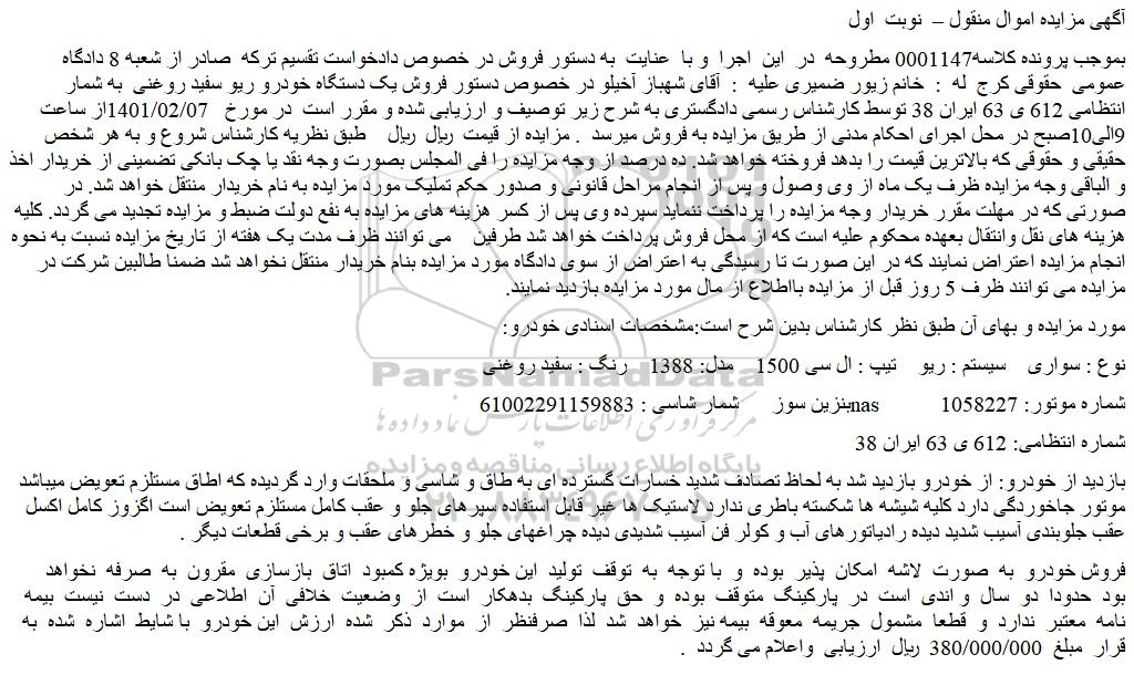 بموجب پرونده کلاسه0001147 مطروحه در این اجرا و با عنایت به دستور فروش در خصوص دادخواست تقسیم ترکه صادر از شعبه 8 دادگاه عمومی حقوقی کرج له : خانم زیور ضمیری علیه : آقای شهباز آخیلو در خصوص دستور فروش یک دستگاه خودرو ریو سفید روغنی به شمار انتظامی 612 ی 63 ایران 38 توسط کارشناس رسمی دادگستری به شرح زیر توصیف و ارزیابی شده و مقرر است در مورخ 1401/02/07از ساعت 9الی10صبح در محل اجرای احکام مدنی از طریق مزایده به فروش میرسد . مزایده از قیمت ریال ریال طبق نظریه کارشناس شروع و به هر شخص حقیقی و حقوقی که بالاترین قیمت را بدهد فروخته خواهد شد. ده درصد از وجه مزایده را فی المجلس بصورت وجه نقد یا چک بانکی تضمینی از خریدار اخذ و الباقی وجه مزایده ظرف یک ماه از وی وصول و پس از انجام مراحل قانونی و صدور حکم تملیک مورد مزایده به نام خریدار منتقل خواهد شد. در صورتی که در مهلت مقرر خریدار وجه مزایده را پرداخت ننماید سپرده وی پس از کسر هزینه های مزایده به نفع دولت ضبط و مزایده تجدید می گردد. کلیه هزینه های نقل وانتقال بعهده محکوم علیه است که از محل فروش پرداخت خواهد شد طرفین می توانند ظرف مدت یک هفته از تاریخ مزایده نسبت به نحوه انجام مزایده اعتراض نمایند که در این صورت تا رسیدگی به اعتراض از سوی دادگاه مورد مزایده بنام خریدار منتقل نخواهد شد ضمنا طالبین شرکت در مزایده می توانند ظرف 5 روز قبل از مزایده بااطلاع از مال مورد مزایده بازدید نمایند.
