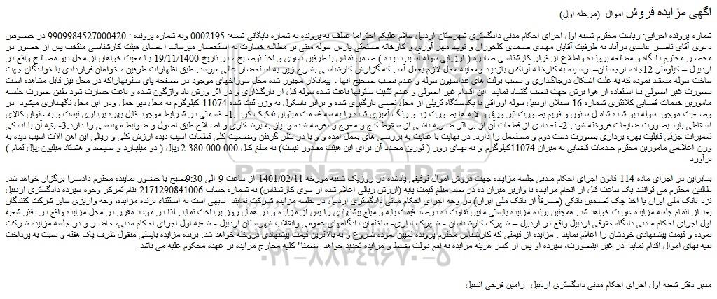 بنابراین در اجرای ماده 114 قانون اجرای احکام مدنی جلسه مزایده جهت فروش اموال توقیفی یادشده در روزیک شنبه مورخه 1401/02/11 از ساعت 9 الی 9:30صبح با حضور نماینده محترم دادسرا برگزار خواهد شد. طالبین محترم می توانند یک ساعت قبل از انجام مزایده با واریز میزان ده در صد مبلغ قیمت پایه (ارزش ریالی اعلام شده از سوی کارشناس) به شماره حساب 2171290841006 بنام تمرکز وجوه سپرده دادگستری اردبیل نزد بانک ملی ایران یا اخذ چک تضمین بانکی (صرفاً از بانک ملی ایران) در وجه اجرای احکام مدنی دادگستری اردبیل در جلسه مزایده شرکت نمایند. بدیهی است به استثناء برنده مزایده، وجه واریزی سایر شرکت کنندگان بعد از اتمام جلسه مزایده عودت خواهد شد. همچنین برنده مزایده بایستی مابین تفاوت ده درصد قیمت پایه و مبلغ پیشنهادی را پس از مزایده و در همان روز پرداخت نماید. لذا در موعد مقرر در محل مزایده واقع در دفتر شعبه اول اجرای احکام مدنی دادگاه حقوقی اردبیل واقع در اردبیل – شهرک کارشناسان - شهرک اداری- ساختمان دادگاههای عمومی وانقلاب شهرستان اردبیل - شعبه اول اجرای احکام مدنی، حاضر و در جلسه مزایده شرکت نموده و قیمت پیشنهادی خودشان را اعلام نمایند . مزایده از قیمتی که کارشناس محترم پرونده تعیین نموده شروع و به بالاترین قیمت پیشنهادی فروخته خواهد شد. برنده مزایده بایستی منقول ظرف یک هفته و نسبت به پرداخت بقیه بهای اموال اقدام نماید  در غیر اینصورت، سپرده او پس از کسر هزینه مزایده به نفع دولت ضبط و مزایده تجدید خواهد. ضمنا" کلیه مخارج مزایده بر عهده محکوم علیه می باشد.