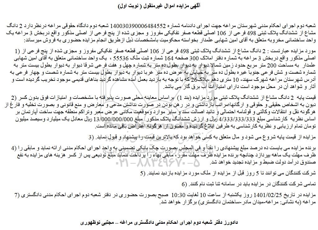شعبه دوم اجرای احکام مدنی شهرستان مراغه جهت اجرای دادنامه شماره 140030390006484552 شعبه دوم دادگاه حقوقی مراغه درنظردارد 2 دانگ مشاع از ششدانگ پلاک ثبتی 498 فرعی از 106 اصلی قطعه صفر تفکیکی مفروز و مجزی شده از پنج فرعی از اصلی مذکور واقع دربخش 3 مراغه یک واحد ساختمانی مخروبه متعلق به آقای امین شهابی علمدار بخواسته محکومیت بامشخصات ذیل ازطریق انجام مزایده حضوری به فروش میرساند: