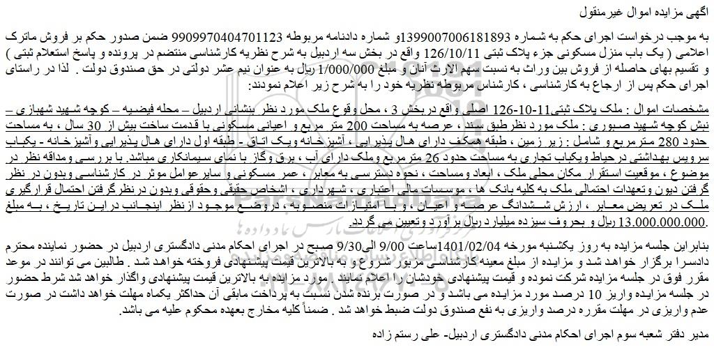 به موجب درخواست اجرای حکم به شماره 1399007006181893و شماره دادنامه مربوطه 9909970404701123 ضمن صدور حکم بر فروش ماترک اعلامی ( یک باب منزل مسکونی جزء پلاک ثبتی 126/10/11 واقع در بخش سه اردبیل به شرح نظریه کارشناسی منتضم در پرونده و پاسخ استعلام ثبتی ) و تقسیم بهای حاصله از فروش بین وراث به نسبت سهم الارث آنان و مبلغ 1/000/000 ریال به عنوان نیم عشر دولتی در حق صندوق دولت . لذا در راستای اجرای حکم پس از ارجاع به کارشناسی ، کارشناس مربوطه نظریه خود را به شرح زیر اعلام نمودند: