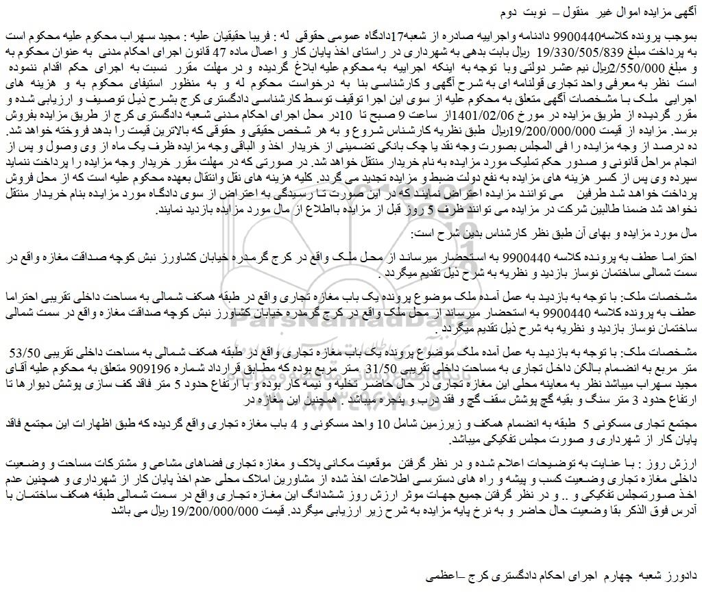بموجب پرونده کلاسه9900440 دادنامه واجراییه صادره از شعبه17دادگاه عمومی حقوقی له : فریبا حقیقیان علیه : مجید سهراب محکوم علیه محکوم است به پرداخت مبلغ 19/330/505/839 ریال بابت بدهی به شهرداری در راستای اخذ پایان کار و اعمال ماده 47 قانون اجرای احکام مدنی به عنوان محکوم به و مبلغ 2/550/000ریال نیم عشر دولتی وبا توجه به اینکه اجراییه به محکوم علیه ابلاغ گردیده و در مهلت مقرر نسبت به اجرای حکم اقدام ننموده است نظر به معرفی واحد تجاری قولنامه ای به شرح آگهی و کارشناسی بنا به درخواست محکوم له و به منظور استیفای محکوم به و هزینه های اجرایی ملک با مشخصات آگهی متعلق به محکوم علیه از سوی این اجرا توقیف توسط کارشناسی دادگستری کرج بشرح ذیل توصیف و ارزیابی شده و مقرر گردیده از طریق مزایده در مورخ 1401/02/06از ساعت 9 صبح تا 10در محل اجرای احکام مدنی شعبه دادگستری کرج از طریق مزایده بفروش برسد. مزایده از قیمت 19/200/000/000ریال طبق نظریه کارشناس شروع و به هر شخص حقیقی و حقوقی که بالاترین قیمت را بدهد فروخته خواهد شد. ده درصد از وجه مزایده را فی المجلس بصورت وجه نقد یا چک بانکی تضمینی از خریدار اخذ و الباقی وجه مزایده ظرف یک ماه از وی وصول و پس از انجام مراحل قانونی و صدور حکم تملیک مورد مزایده به نام خریدار منتقل خواهد شد. در صورتی که در مهلت مقرر خریدار وجه مزایده را پرداخت ننماید سپرده وی پس از کسر هزینه های مزایده به نفع دولت ضبط و مزایده تجدید می گردد. کلیه هزینه های نقل وانتقال بعهده محکوم علیه است که از محل فروش پرداخت خواهد شد طرفین می توانند مزایده اعتراض نمایند که در این صورت تا رسیدگی به اعتراض از سوی دادگاه مورد مزایده بنام خریدار منتقل نخواهد شد ضمنا طالبین شرکت در مزایده می توانند ظرف 5 روز قبل از مزایده بااطلاع از مال مورد مزایده بازدید نمایند.