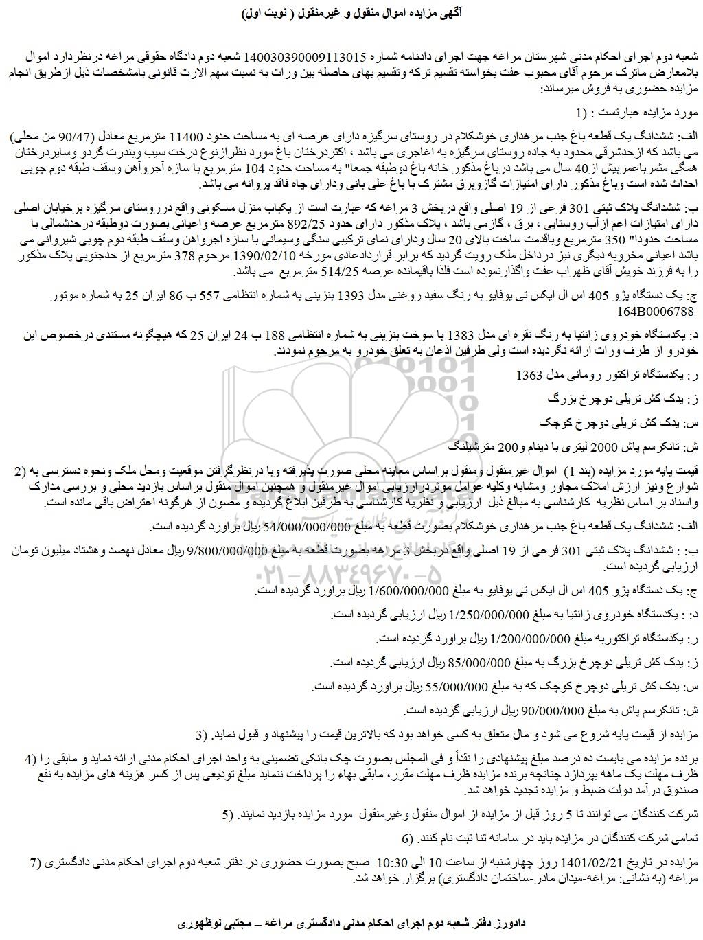 شعبه دوم اجرای احکام مدنی شهرستان مراغه جهت اجرای دادنامه شماره 140030390009113015 شعبه دوم دادگاه حقوقی مراغه درنظردارد اموال بلامعارض ماترک مرحوم آقای محبوب عفت بخواسته تقسیم ترکه وتقسیم بهای حاصله بین وراث به نسبت سهم الارث قانونی بامشخصات ذیل ازطریق انجام مزایده حضوری به فروش میرساند: