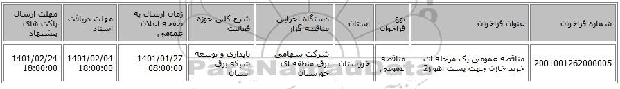 | 2001001262000005 | مناقصه عمومی یک مرحله ای خرید خازن جهت پست اهواز2 | مناقصه عمومی | خوزستان | شرکت سهامی برق منطقه ای خوزستان | پایداری و توسعه شبکه برق استان | 1401/01/27 08:00:00 | 1401/02/04 18:00:00 | 1401/02/24 18:00:00 |