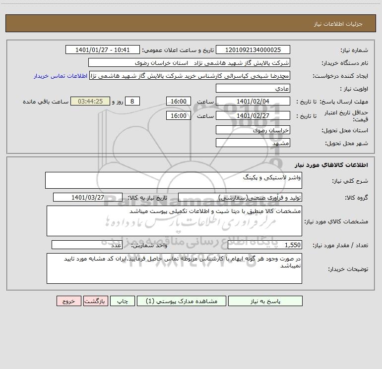 نام دستگاه خریدار:شرکت پالایش گاز شهید هاشمی نژاد استان خراسان رضوی