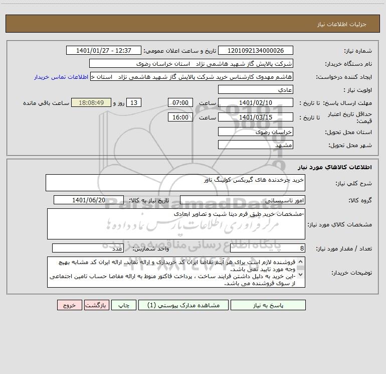 نام دستگاه خریدار:شرکت پالایش گاز شهید هاشمی نژاد استان خراسان رضوی
