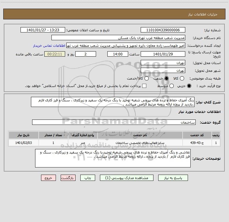 شرح کلی نیاز: رنگ آمیزی حفاظ و نرده های بیرونی شعبه توحید با رنگ درجه یک سفید و زیرکاری ، سنگ و فرز کاری لازم .بازدید از پروژه ارائه رزومه مرتبط الزامی میباشد .