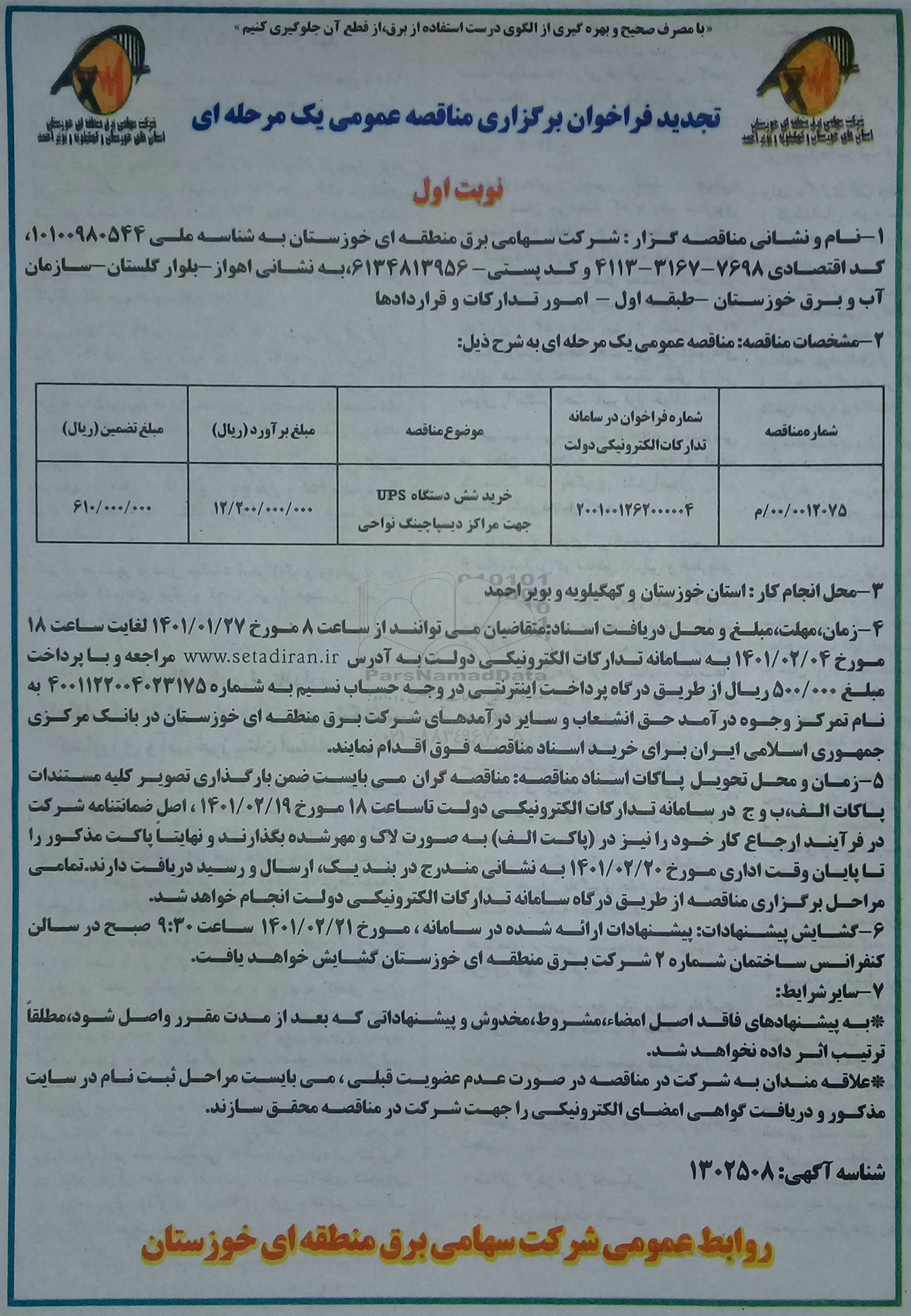 1. نام و نشانی مناقصه گزار: شرکت سهامی برق منطقه ای خوزستان به شناسه ملی