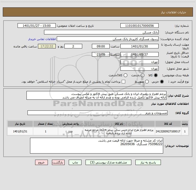 شرح کلی نیاز: پرچم اهتزاز و رومیزی ایران و بانک مسکن طبق پیش فاکتور و عکس پیوست.