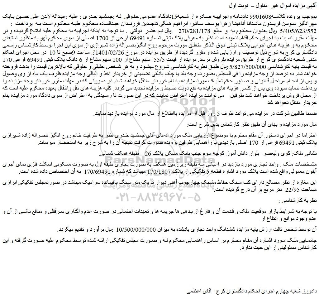 بموجب پرونده کلاسه9901608 دادنامه واجراییه صادره از شعبه15دادگاه عمومی حقوقی له :جمشید خدری : علیه :عبداله لادن علی حسین بابک مهرانگیز سوسن فریدون ماندانا آناهیتا زهرا یوسف ساتیرا ابراهیم همگی تاجدین فرزندان عبدالساده محکوم علیه محکوم است به پرداخت : 5/405/623/552 ریال بعنوان محکوم به و مبلغ 270/281/178 ریال نیم عشر دولتی . با توجه به اینکه اجراییه به محکوم علیه ابلاغ گردیده و در مهلت مقرر نسبت به اجرای حکم اقدام ننموده است نظر به معرفی پلاک ثبتی شماره 69491 فرعی از 1700 اصلی از سوی محکوم لهو به منظور استیفای محکوم به و هزینه های اجرایی پلاک ثبتی فوق الذکر متعلق مورث مرحوم روح انگیزنصراله زاده شیرازی از سوی این اجرا توسط کارشناس رسمی دادگستری کرج به شرح ذیل توصیف و ارزیابی شده و مقرر گردیده از طریق مزایده در مورخ 1401/02/26از ساعت 9صبح تا 10 در محل اجرای احکام مدنی شعبه دادگستری کرج از طریق مزایده بفروش برسد. مزایده از قیمت 55/5 سهم مشاع از 100 سهم مشاع از 6 دانگ پلاک ثبتی 69491 فرعی 170 به قیمت پایه کارشناسی 5/827/500/000 ریال طبق نظریه کارشناسی شروع میشود و به هر شخص حقیقی و حقوقی که بالاترین قیمت را بدهد فروخته خواهد شد. ده درصد از وجه مزایده را فی المجلس بصورت وجه نقد یا چک بانکی تضمینی از خریدار اخذ و الباقی وجه مزایده ظرف یک ماه از وی وصول و پس از انجام مراحل قانونی و صدور حکم تملیک مورد مزایده به نام خریدار منتقل خواهد شد. در صورتی که در مهلت مقرر خریدار وجه مزایده را پرداخت ننماید سپرده وی پس از کسر هزینه های مزایده به نفع دولت ضبط و مزایده تجدید می گردد. کلیه هزینه های نقل وانتقال بعهده محکوم علیه است که از محل فروش پرداخت خواهد شد طرفین می توانند مزایده اعتراض نمایند که در این صورت تا رسیدگی به اعتراض از سوی دادگاه مورد مزایده بنام خریدار منتقل نخواهد شد