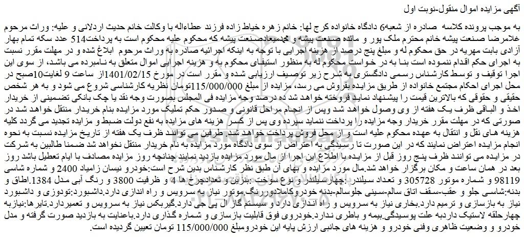به موجب پرونده کلاسه صادره از شعبه6 دادگاه خانواده کرج لها: خانم زهره خیاط زاده فرزند عطاءاله با وکالت خانم حدیث اردلانی و علیه: وراث مرحوم غلامرضا صنعت پیشه خانم محترم ملک پور و مائده صنعت پیشه و محمدمیعادصنعت پیشه که محکوم علیه محکوم است به پرداخت514 عدد سکه تمام بهار آزادی بابت مهریه در حق محکوم له و مبلغ پنج درصد از هزینه اجرایی با توجه به اینکه اجرائیه صادره به وراث مرحوم ابلاغ شده و در مهلت مقرر نسبت به اجرای حکم اقدام ننموده است بنا به در خواست محکوم له به منظور استیفای محکوم به و هزینه اجرایی اموال متعلق به نامبرده می باشد، از سوی این اجرا توقیف و توسط کارشناس رسمی دادگستری به شرح زیر توصیف ارزیابی شده و مقرر است در مورخ 1401/02/15از ساعت 9 لغایت10صبح در محل اجرای احکام مجتمع خانواده از طریق مزایده بفروش می رسد، مزایده از مبلغ 115/000/000تومان نظریه کارشناسی شروع می شود و به هر شخص حقیقی و حقوقی که بالاترین قیمت را پیشنهاد نماید فروخته خواهد شد ده درصد وجه مزایده فی المجلس بصورت وجه نقد یا چک بانکی تضمینی از خریدار اخذ و الباقی ظرف یک هفته از وی وصول خواهد شد وپس از انجام مراحل قانونی و صدور حکم تملیک مورد مزایده بنام خریدار منتقل خواهد شد در صورتی که در مهلت مقرر خریدار وجه مزایده را پرداخت ننماید سپرده وی پس از کسر هزینه های مزایده به نفع دولت ضبط و مزایده تجدید می گردد کلیه هزینه های نقل و انتقال به عهده محکوم علیه است و از محل فروش پرداخت خواهد شد. طرفین می توانند ظرف یک هفته از تاریخ مزایده نسبت به نحوه انجام مزایده اعتراض نمایند که در این صورت تا رسیدگی به اعتراض از سوی دادگاه مورد مزایده به نام خریدار منتقل نخواهد شد ضمنا طالبین به شرکت در مزایده می توانند ظرف پنج روز قبل از مزایده با اطلاع این اجرا از مال مورد مزایده بازدید نمایند چنانچه روز مزایده مصادف با ایام تعطیل باشد روز بعد در همان ساعت و مکان برگزار خواهد شد.مال مورد مزایده و بهای آن طبق نظر کارشناس بدین شرح است:خودرو نیسان زامیاد 2400 و شماره شاسی 98119 و شماره موتور 305728 و تعداد سیلندر :چهارسیلندر و نوع سوخت :بنزین و تعدادچرخ ها 4 و ظرفیت 3800 و رنگ آبی مدل 1384.اطاق و بدنه:شاسی جلو و عقب-سقف اتاق سالم-سینی جلوسالم-بدنه خودروکاملادوررنگ.موتور نیاز به سرویس و راه اندازی دارد.داشبورد:تودوزی و داشبورد نیاز به بازسازی و ترمیم دارد.بخاری نیاز به سرویس و راه اندازی دارد و سیستم گاز ال پی جی دارد.گیربکس نیاز به سرویس و تعمیردارد.تایرها:نیازبه چهارحلقه لاستیک داردبه علت پوسیدگی.بیمه و باطری ندارد.خودروی فوق قابلیت بازسازی و شماره گذاری دارد.باعنایت به بازدید صورت گرفته و مدل خودرو و وضعیت ظاهری وفنی خودرو و هزینه های جانبی ارزش پایه این خودرومبلغ 115/000/000 تومان تعیین گردیده است.