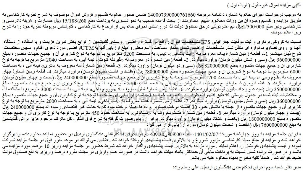 به موجب درخواست اجرای حکم به شماره دادنامه مربوطه 140007390000761660 ضمن صدور حکم به تقسیم و فروش اموال موصوف به شرح نظریه کارشناسی به طریق مزایده و تقسیم وجوه آن بین وراث محکوم علیهم  محکومند از بابت قاعده تسبیب به نحو تساوی به پرداخت مبلغ 15/188/268 ریال خسارت و هزینه دادرسی و کارشناسی ونیز مبلغ 1/500/000ریال نیم عشردولتی درحق صندوق دولت لذا در راستای اجرای حکم پس از ارجاع به کارشناسی ، کارشناس مربوطه نظریه خود را به شرح زیر اعلام نمودند: