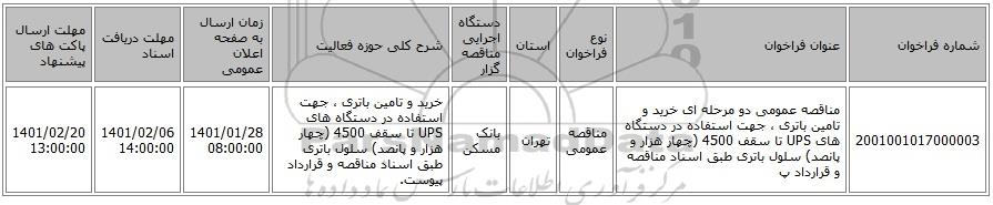 2001001017000003 | مناقصه عمومی دو مرحله ای خرید و تامین باتری ، جهت استفاده در دستگاه های UPS تا سقف 4500 (چهار هزار و پانصد) سلول باتری طبق اسناد مناقصه و قرارداد پ | مناقصه عمومی | تهران | بانک مسکن | خرید و تامین باتری ، جهت استفاده در دستگاه های UPS تا سقف 4500 (چهار هزار و پانصد) سلول باتری طبق اسناد مناقصه و قرارداد پیوست. | 1401/01/28 08:00:00 | 1401/02/06 14:00:00 | 1401/02/20 13:00:00 |