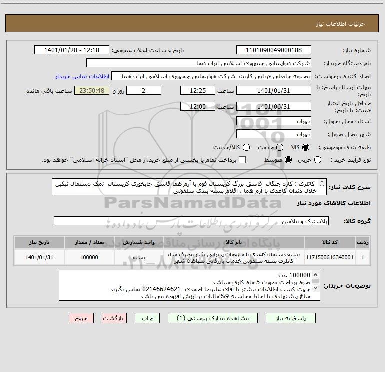 شرح کلی نیاز: کاتلری : کارد چنگال قاشق بزرگ کریستال فوم با آرم هما قاشق چایخوری کریستال نمک دستمال نپکین خلال دندان کاغذی با آرم هما ، اقلام بسته بندی سلفونی