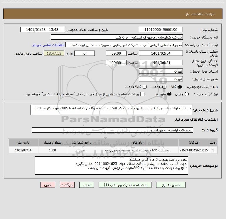 شرح کلی نیاز: دستمال توالت دلسی 2 قلو 1000 رول - ایران کد انتخاب شده صرفا جهت تشابه با کالای مورد نظر میباشد