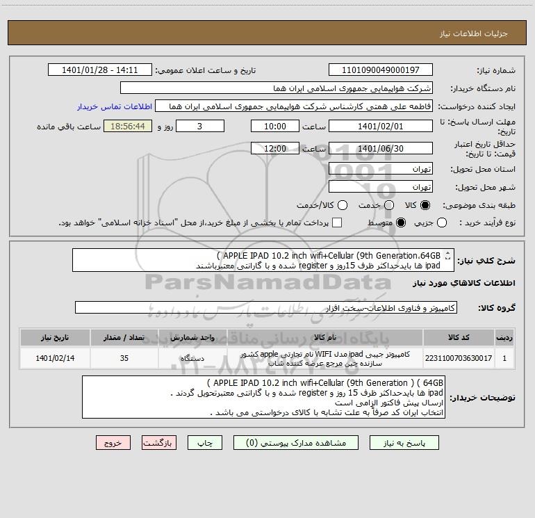 شرح کلی نیاز: APPLE IPAD 10.2 inch wifi+Cellular (9th Generation،64GB )
