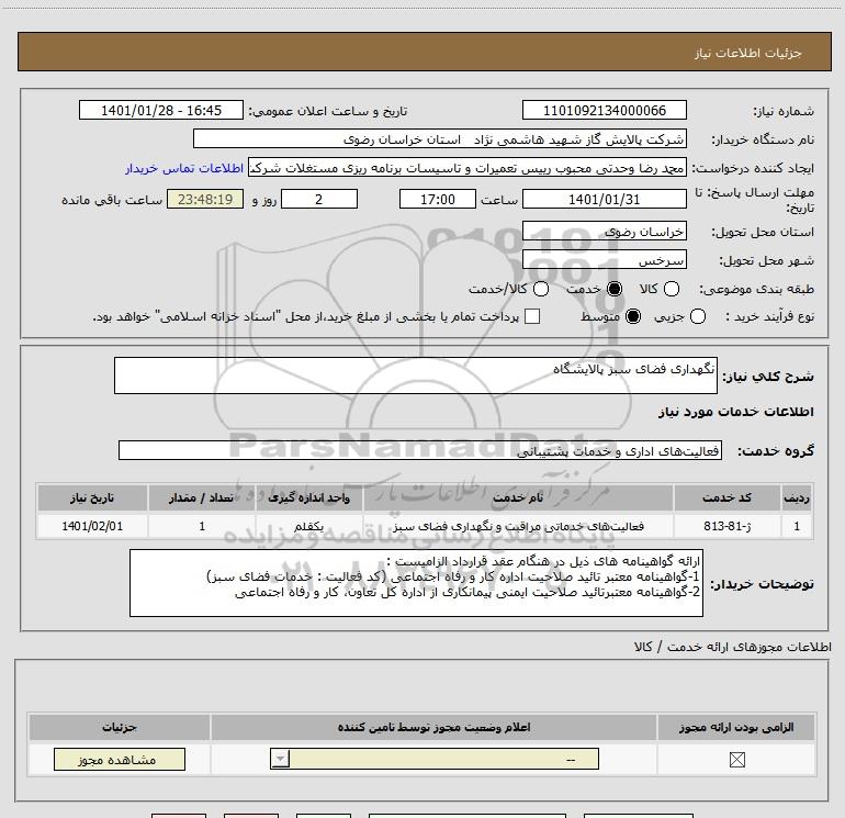 شرح کلی نیاز: نگهداری فضای سبز پالایشگاه