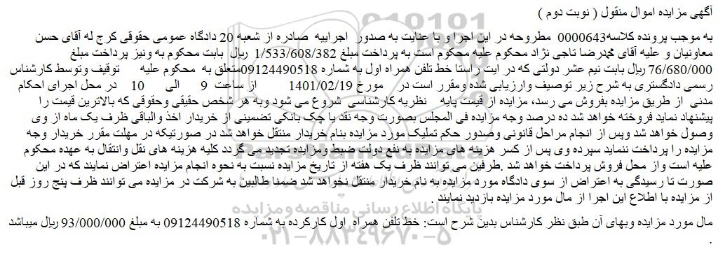 به موجب پرونده کلاسه0000643 مطروحه در این اجرا و با عنایت به صدور اجراییه صادره از شعبه 20 دادگاه عمومی حقوقی کرج له آقای حسن معاونیان و علیه آقای محمدرضا تاجی نژاد محکوم علیه محکوم است به پرداخت مبلغ 1/533/608/382 ریال بابت محکوم به ونیز پرداخت مبلغ 76/680/000 ریال بابت نیم عشر دولتی که در ایت راستا خط تلفن همراه اول به شماره 09124490518متعلق به محکوم علیه توقیف وتوسط کارشناس رسمی دادگستری به شرح زیر توصیف وارزیابی شده ومقرر است در مورخ 1401/02/19 از ساعت 9 الی 10 در محل اجرای احکام مدنی از طریق مزایده بفروش می رسد، مزایده از قیمت پایه نظریه کارشناسی شروع می شود وبه هر شخص حقیقی وحقوقی که بالاترین قیمت را پیشنهاد نماید فروخته خواهد شد ده درصد وجه مزایده فی المجلس بصورت وجه نقد یا چک بانکی تضمینی از خریدار اخذ والباقی ظرف یک ماه از وی وصول خواهد شد وپس از انجام مراحل قانونی وصدور حکم تملیک مورد مزایده بنام خریدار منتقل خواهد شد در صورتیکه در مهلت مقرر خریدار وجه مزایده را پرداخت ننماید سپرده وی پس از کسر هزینه های مزایده به نفع دولت ضبط ومزایده تجدید می گردد کلیه هزینه های نقل وانتقال به عهده محکوم علیه است واز محل فروش پرداخت خواهد شد .طرفین می توانند ظرف یک هفته از تاریخ مزایده نسبت به نحوه انجام مزایده اعتراض نمایند که در این صورت تا رسیدگی به اعتراض از سوی دادگاه مورد مزایده به نام خریدار منتقل نخواهد شد ضمنا طالبین به شرکت در مزایده می توانند ظرف پنج روز قبل از مزایده با اطلاع این اجرا از مال مورد مزایده بازدید نمایند .