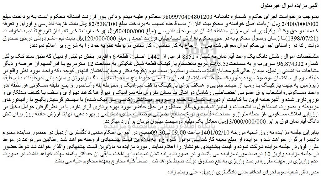 بنابراین جلسه مزایده به روز شنبه مورخه 1401/02/10ساعت 09:00الی09:30صبح در اجرای احکام مدنی دادگستری اردبیل در حضور نماینده محترم دادسرا برگزار خواهد شد و مزایده از مبلغ معینه کارشناسی مزبور شروع و به بالاترین قیمت پیشنهادی فروخته خواهد شد . طالبین می توانند در موعد مقرر فوق در جلسه مزایده شرکت نموده و قیمت پیشنهادی خودشان را اعلام نمایند . مورد مزایده به بالاترین قیمت پیشنهادی واگذار خواهد شد شرط حضور در جلسه مزایده واریز 10 درصد مورد مزایده می باشد و در صورت برنده شدن نسبت به پرداخت مابقی آن حداکثر یکماه مهلت خواهد داشت در صورت عدم واریزی در مهلت مقرره درصد واریزی به نفع صندوق دولت ضبط خواهد شد . ضمناً کلیه مخارج بعهده محکوم علیه می باشد.