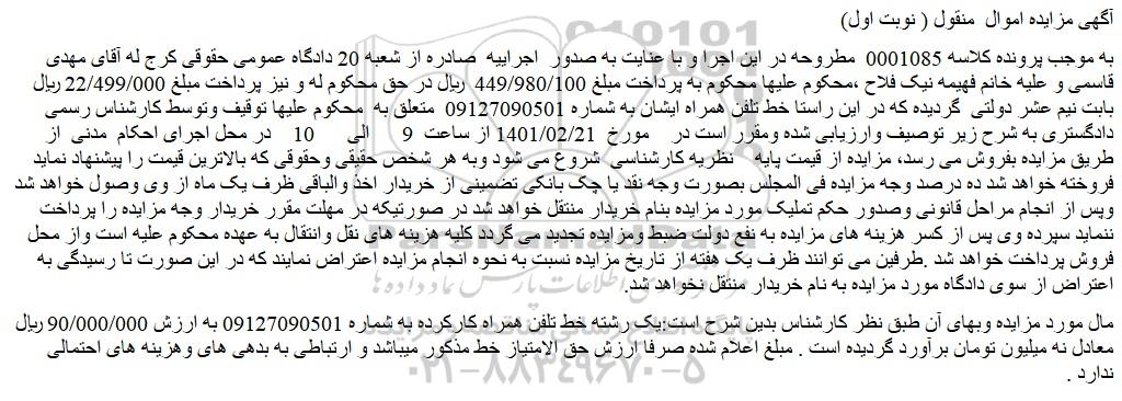 به موجب پرونده کلاسه 0001085  مطروحه در این اجرا و با عنایت به صدور  اجراییه  صادره از شعبه 20 دادگاه عمومی حقوقی کرج له آقای مهدی قاسمی و علیه خانم فهیمه نیک فلاح ،محکوم علیها محکوم به پرداخت مبلغ 449/980/100  ریال در حق محکوم له و نیز پرداخت مبلغ 22/499/000 ریال بابت نیم عشر دولتی  گردیده که در این راستا خط تلفن همراه ایشان به شماره 09127090501  متعلق به  محکوم علیها توقیف وتوسط کارشناس رسمی دادگستری به شرح زیر توصیف وارزیابی شده ومقرر است در    مورخ  1401/02/21 از ساعت  9      الی      10    در محل اجرای احکام  مدنی  از طریق مزایده بفروش می رسد، مزایده از قیمت پایه    نظریه کارشناسی  شروع می شود وبه هر شخص حقیقی وحقوقی که بالاترین قیمت را پیشنهاد نماید فروخته خواهد شد ده درصد وجه مزایده فی المجلس بصورت وجه نقد یا چک بانکی تضمینی از خریدار اخذ والباقی ظرف یک ماه از وی وصول خواهد شد وپس از انجام مراحل قانونی وصدور حکم تملیک مورد مزایده بنام خریدار منتقل خواهد شد در صورتیکه در مهلت مقرر خریدار وجه مزایده را پرداخت ننماید سپرده وی پس از کسر هزینه های مزایده به نفع دولت ضبط ومزایده تجدید می گردد کلیه هزینه های نقل وانتقال به عهده محکوم علیه است واز محل فروش پرداخت خواهد شد .طرفین می توانند ظرف یک هفته از تاریخ مزایده نسبت به نحوه انجام مزایده اعتراض نمایند که در این صورت تا رسیدگی به اعتراض از سوی دادگاه مورد مزایده به نام خریدار منتقل نخواهد شد.